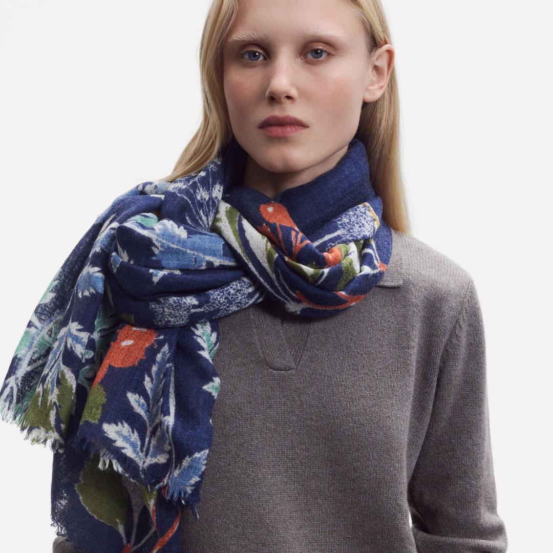 人気のデンマークの植物図鑑からインスパイアされたボタニカル柄は葉茎や根まで繊細に描かれアートな温もりを感じさせます。ウールにシルクカシミア混の軽くて柔らかなタッチと大判サイズならではのダイナミックさで秋冬の襟元を彩ります。嵩張らない生地感もエピスならではの使いやすさです。