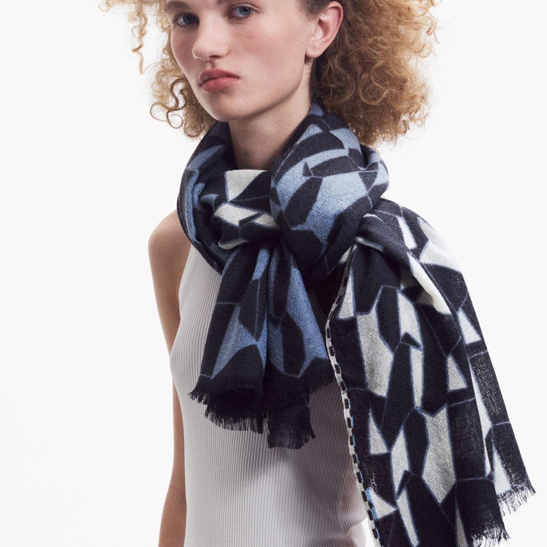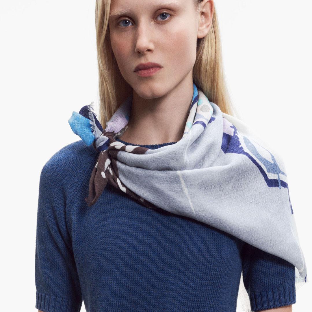 スクエアサイズは、70~75cm正方形、90~100cm正方形の2サイズがあり大き過ぎないのが魅力です。ほとんどがカシミヤやシルク混のため、薄手で柔らかく室内外問わず、ロングシーズン活躍します。今シーズンはストリートアートからインスパイアされた大胆でポップな線や色合いも注目です。