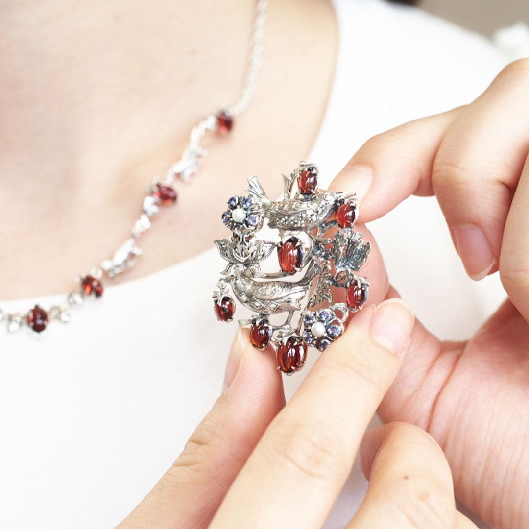 アンティークスタイルのシルバージュエリーを作り続けるブランド、碌山。ヨーロッパの伝統的なデザインと、日本の職人による繊細な銀細工を融合。ウィリアムモリスやムーミンなどを代表に植物や花、クラシカルなモチーフを多く取り入れ、時を経ても色褪せない美しさが魅力です。使用するのは、銀(シルバー)と天然石。細部にまでこだわった立体的な装飾や石留めは、まるで小さな美術品のよう。身に着けるたび、アンティークジュエリーならではの温かみと重厚感を感じられます。